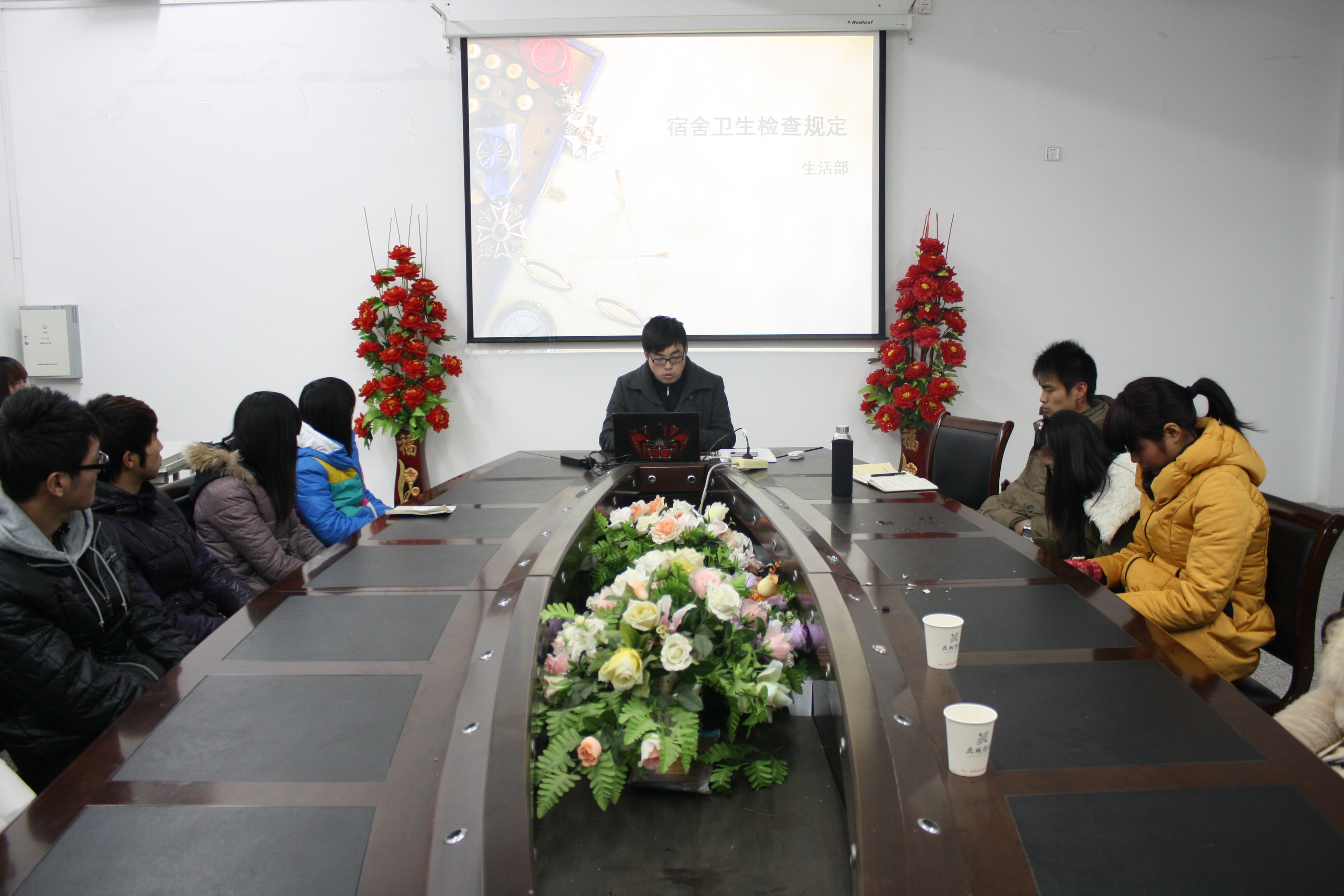 为了加强对宿舍的美化和管理,以优异的成绩创建省高校后勤工作先进集体,艺术系学生分会于2013年3月4日晚19点整在艺术系310会议室召开关于宿舍美化和管理研讨会。会议由系学生分会生活部部长孔睿主持,系学生分会主席缪仕超,各班班长和各宿舍舍长出席会议。