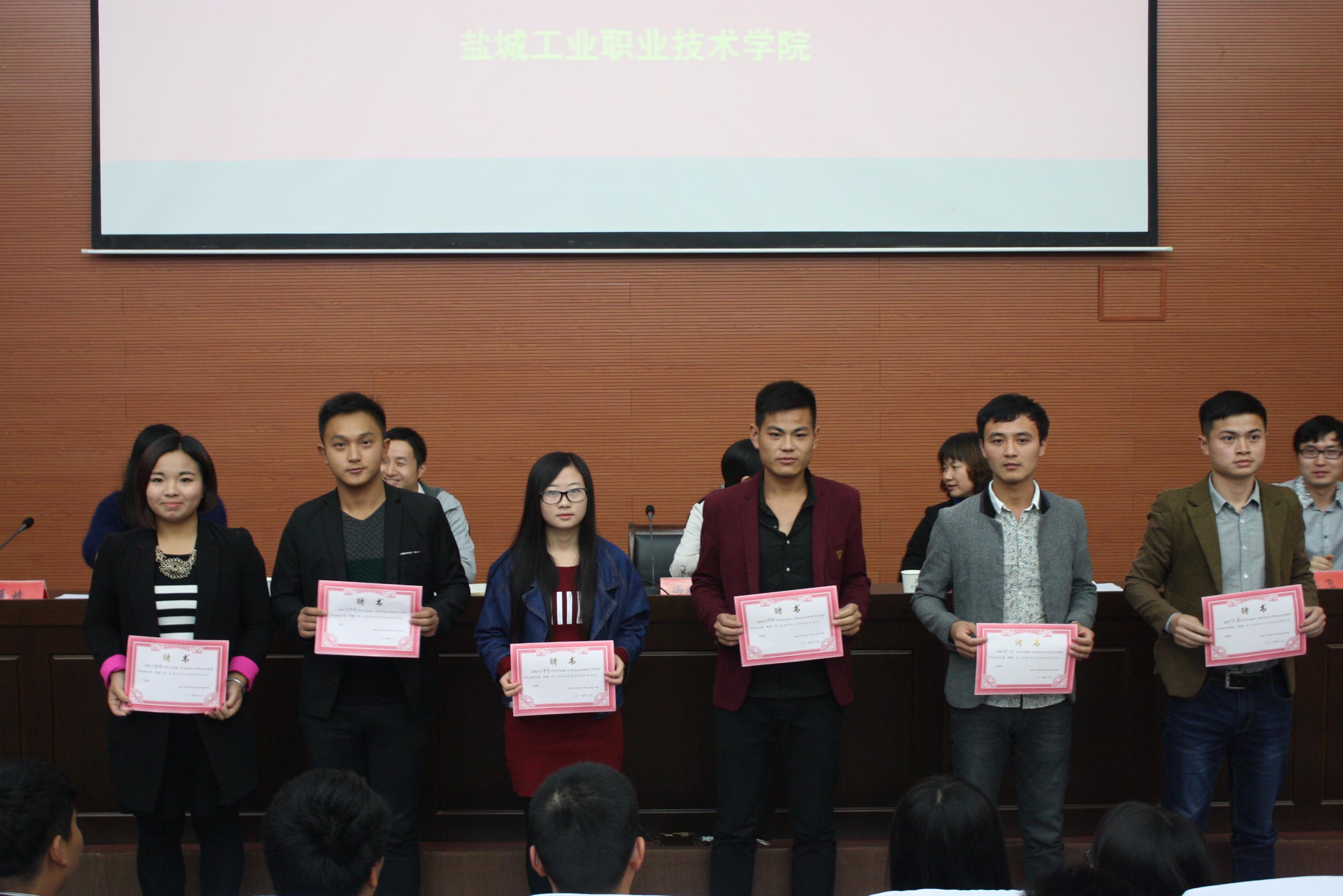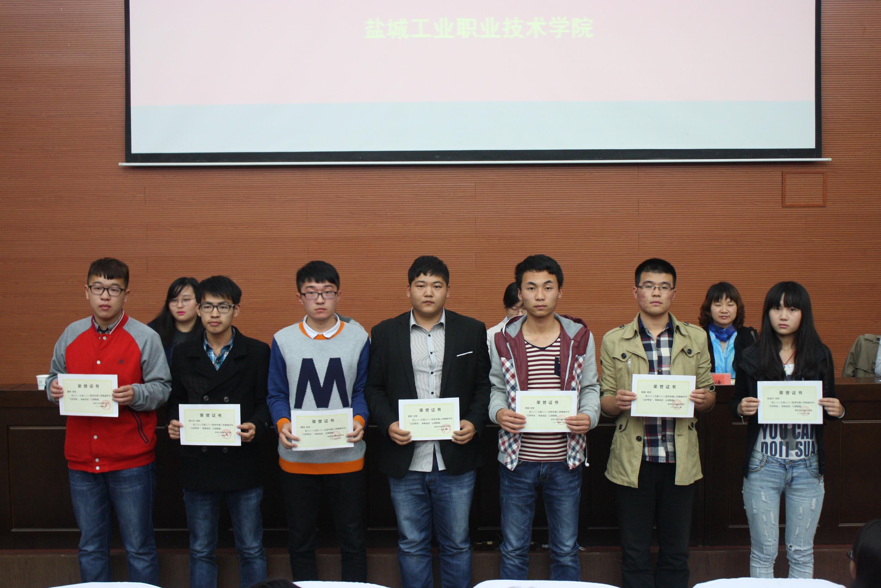 大会在庄严的《国歌》声中拉开序幕,副院长李明宣读盐城工业职业技术学院《关于表彰2013-2014学年第二学期先进集体和先进个人的决定》,宣读完毕后,在团总支书记滕飞的主持下,依次为获奖同学颁发获奖的三好学生、优秀学干、优秀宿舍、先进集体及奖学金获得者的荣誉证书。获奖学生代表孙信德同学上台进行了发言。最后,陈洁副院长对本次会议做出总结,希望本次表彰大会是对全体同学的激励和鞭策,希望同学们以优秀同学为榜样,刻苦学习,奋力拼搏,切实掌握一技之长,真正做到“职业立身,技术报国”,为学校的飞跃发展贡献自己的青春和力量。