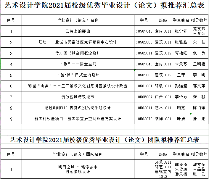 根据教务处关于2021届毕业设计(论文)评优工作的通知,学院在学生申报优秀毕业设计答辩的基础上,经学院评审组评选、党政联席会议讨论决定,拟推选出9件优秀毕业设计和1个优秀毕业设计团队送报学校评优,现予以公示。如有异议,请于两日内与艺术设计学院教科研办公室联系,电话:88583933。