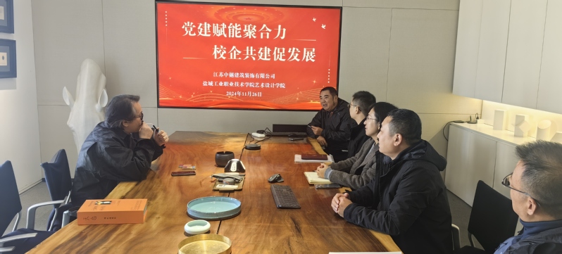 第二部分为校企实地走访,11月26日下午,艺术设计学院领导班子一行走访了江苏中樾建筑装饰有限公司,学院领导介绍了艺术设计学院当下专业开设情况、校企合作成效等,希望进一步深化校企合作建设,加强与合作企业的沟通交流,积极拓宽学院学生实习与就业途径。江苏中樾建筑装饰有限公司负责人详细介绍了公司的发展历程、业务范围以及未来规划。双方就人才培养、项目合作、技术创新等方面进行了深入探讨。