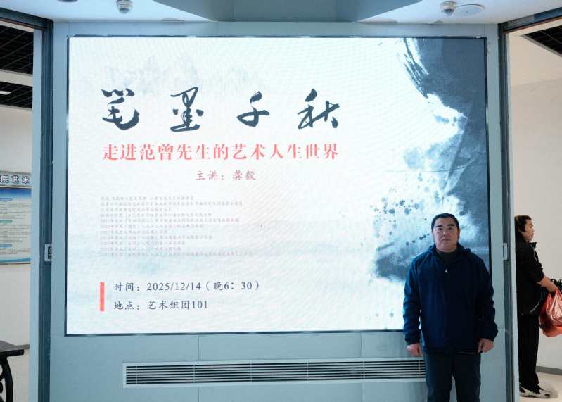 2025年12月14日晚18时30分,“笔墨千秋——走进范曾先生的艺术人生世界”主题讲座在艺术组团101顺利开讲。龚毅教授担任主讲,艺术设计学院2025级新生各专业学生代表参与讲座